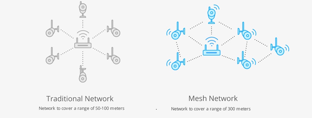 Dankzij Mesh netwerkoplossing dient elke camera als een soort 'opstappunt' (hop point) voor de volgende camera. Hierdoor heb je een sterker WiFi signaal omdat de camera's met elkaar verbinden en niet afhankelijk zijn van de 1-op-1 communicatie met de NVR. Zonder obstructie heeft het netwerk een bereik tot 300 meter (traditioneel netwerk 50-100 meter). De Mesh-verbinding tussen de camera's bij deze set werkt alleen met de FI9925W.
